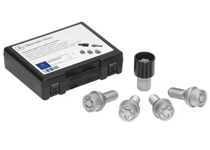 Rim lock set. Wheel Lock Set - Silver M14x1.5x25.5. Don't give thieves a chance: A set of Mercedes-Benz rim locks offers the best possible way to protect your genuine Mercedes-Benz wheels from theft. Take steps to prevent theft by investing in the relevant set – consisting of four rim locks and one key. Supplied in a handy box.